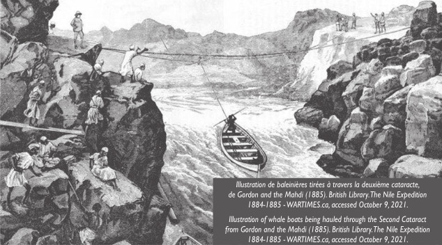 The Ottawa group assembled on September 13, 1884 in front of the Parliament Buildings on Wellington Street. After a rousing send-off by the band of the Governor General’s Foot Guard, the volunteers fell in and marched to the Union Depot in LeBreton Flats. Here, a large crowd had gathered to see them off on a special CPR train to Montreal. The next day they met up with the other contingents and set sail on the steamer, Ocean King, for Alexandria, Egypt, arriving in early October. They made their way to the main British base at Wadi Halfa. There, the Canadian voyageurs were divided up and assigned among the battalions and corps in boats. They provided support enabling the military to travel up the Nile. They navigated the cataracts from Wadi Halfa to Khartoum using special skills for their river ascent and different skills for their return descent.
